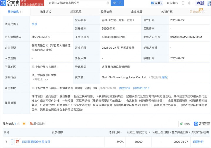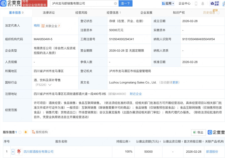 企查查APP显示,近日,泸州龙马郎销售有限公司、古蔺红花郎销售有限公司、古蔺郎酒电子商务有限公司成立,注册资本合计11亿元,经营范围均包括酒类经营、食品销售、食品互联网销售等。企查查股权穿透显示,上述三家公司均由四川郎酒股份有限公司全资持股。
